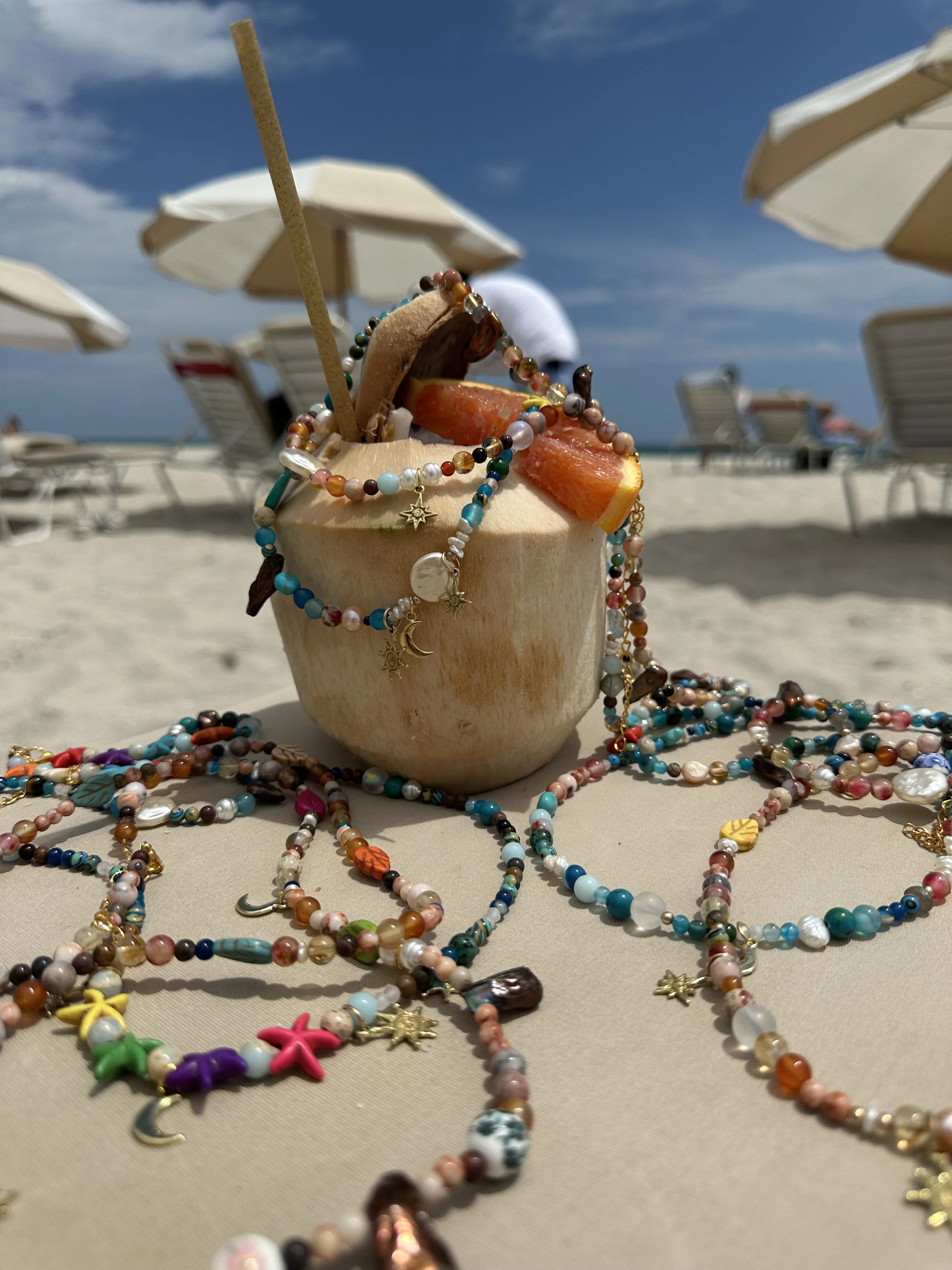 The belly chains are handmade with fresh water pearls, crystals, beads plus brass sun, moon, stars from Ammunet’s CIELO collection